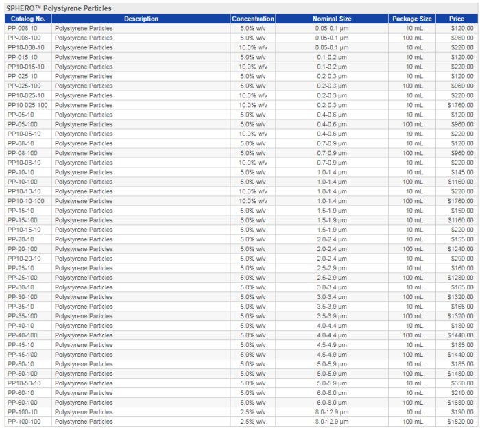 The polystyrene particles are prepared by using emulsion polymerization process. Particles supplied by Spherotech have been precleaned using either mixed bed ion exchange or by centrifugation. Further cleaning by user is usually not required. The size of particles is determined by either NICOMP Laser Particle Sizer or visually by Scanning Electron Microscope.