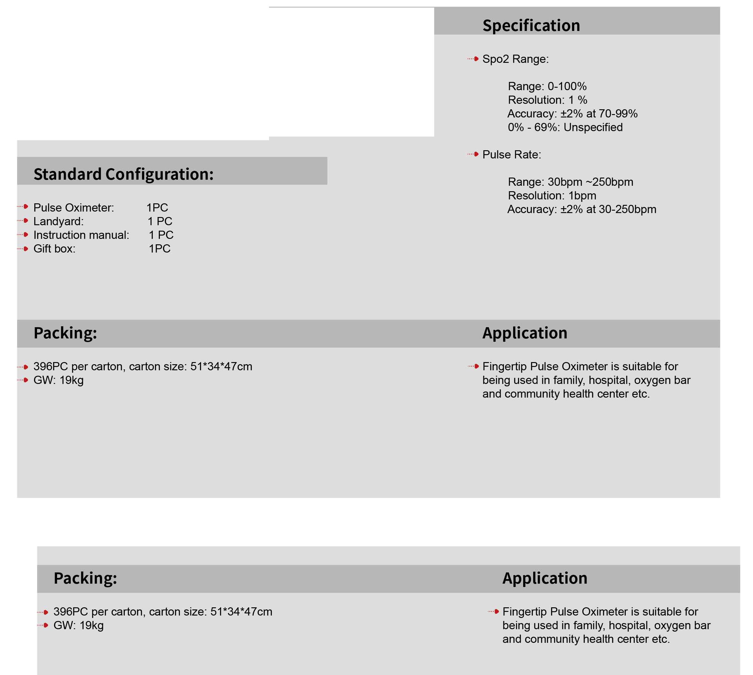 Color LCD display with four directions. Single button operation. Compact and power economic design. Sp02 and pulse monitoring with waveform display. Adjustable audio and visual alarm. Convenient two standard AAA batteries.