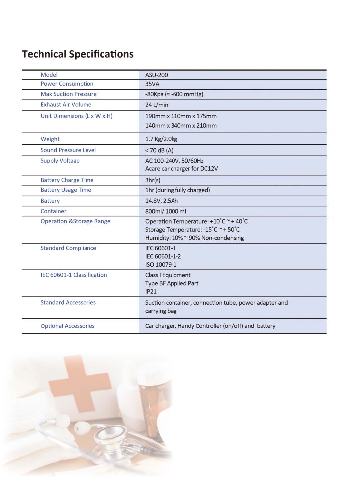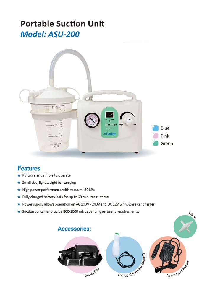 Model: ASU-200 / Acare Suction Unit is a reliable portable device. It is suitable for hospital, clinic and outdoor for patient to draw out sputum. Acare suction unit.