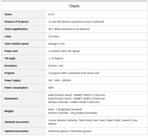 Diversified charts (4 types of A/C/D/R) per country are retained including binocular balance, aniseikonia, stereopsis, binocular vision test chart