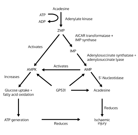 GP531, an analogue of Acadesine, directly activates of AMPK and indirectly augments endogenous adenosine, reducing cardiac injury.