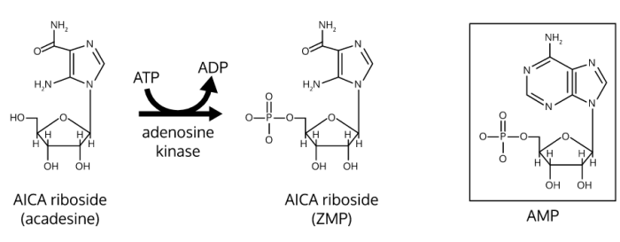 Change to: Acadesine is converted to AICA ribotide (ZMP) by adenosine kinase, which also converts adenosine to adenosine monophosphate (AMP). Acadesine selectively increases endogenous adenosine levels during episodes of cellular stress in which the breakdown of ATP exceeds ATP synthesis.