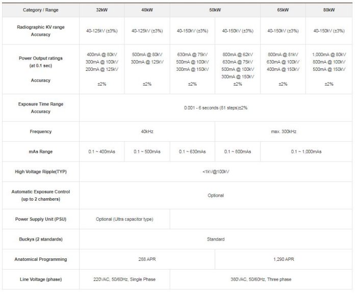 Our generators are suitable and excellent complement for all radiographic X-ray systems. They consist of either film or digital systems and adopt a user-friendly interface and operation. These generators meet both clinic and hospital grade requirements and they are available in either single-phase or three-phase and in output powers of 32kW, 40kW, 50kW, 65kW and 80kW.