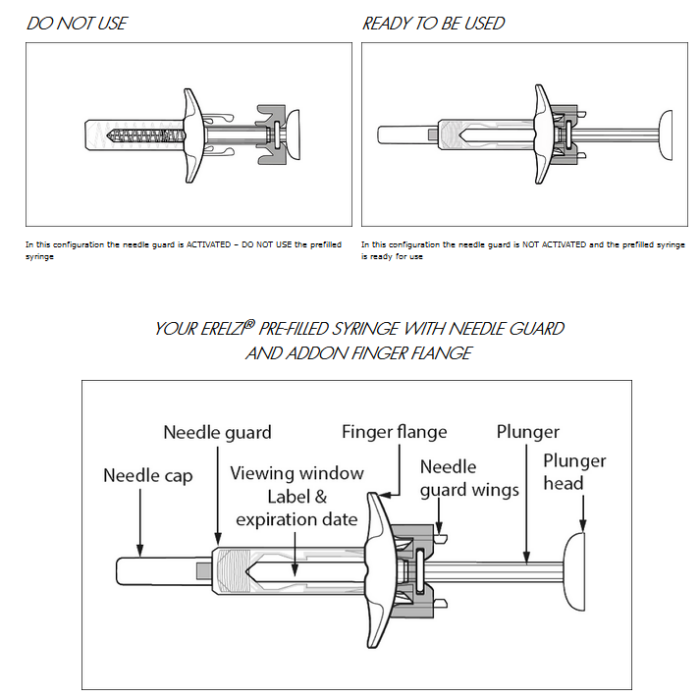 - Inspect the syringe. The liquid should be clear or slightly opalescent, colourless to slightly yellowish, and may contain small white or almost translucent particles of protein. This appearance is normal for Erelzi. Do not use if the liquid is cloudy, discoloured, or has large lumps, flakes, or coloured particles. Do not use if the syringe is broken or the needle guard is activated. In all these cases, return the entire product pack to the pharmacy.