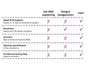 PMP™ is a qPCR-based approach on Thermo Fisher Scientific’s OpenArray platform. This allows PMP to deliver accurate and detailed information about the microbiome in a high-throughput format, which is readily available for interpretation, and in a faster timeframe than traditional microbiome analysis approaches.