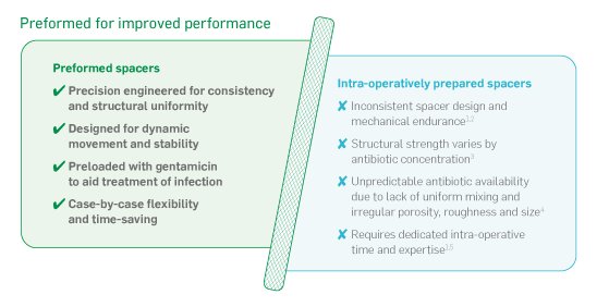 The Synicem spacer range provides a ready-to-use preformed spacer with the performance characteristics you need for your 2-stage revision procedures.Designed to overcome the challenges of using traditional intra-operative moulded and handmade spacers, Synicem spacers support revisions of the hip, knee and shoulder to preserve articular space and aid the treatment of infection.