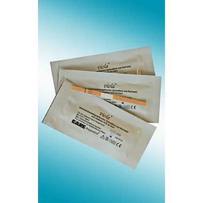 Qualitative (+/-) detection of pregnancy from urine using test strips, achieved in a few minutes. Advantages: high sensitivity: 25 mIU hCG/ml, quick result, easy to use