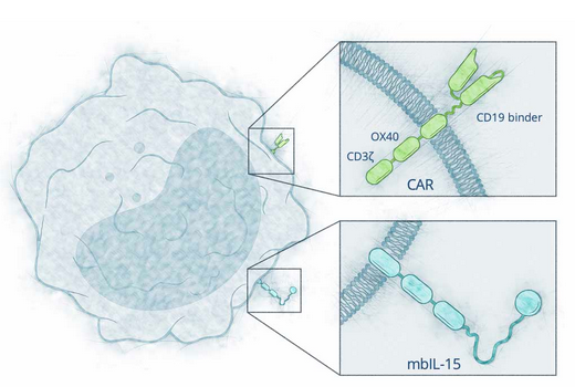 OX40 costimulatory domain, CD3ζ signaling moiety, membrane bound IL-15.
