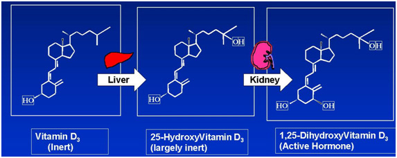 The inert Vitamin D3 is then transported to the liver where a hydroxyl group [OH] is added to form a semi-hormone, and then to the kidney where an additional hydroxyl group [OH] is added to form the fully active Vitamin D3 hormone.