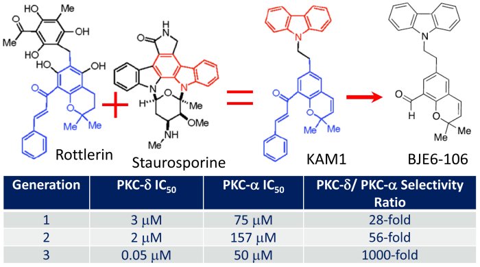 - Structural aspects of first generation inhibitor rottlerin and staurosporine(pan-PKC inhibitor) were combined to create second generation inhibitor KAM1