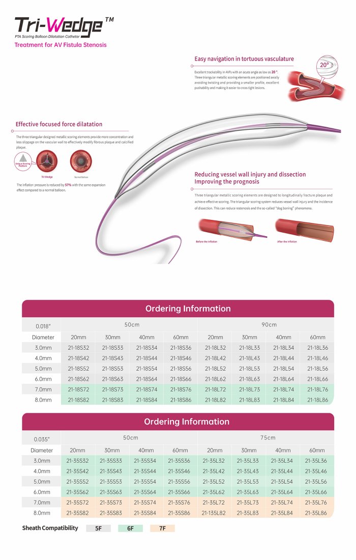 Excellent trackability in AVFs with an acute angle as low as 20 °. Three triangular metallic scoring elements are positioned axially avoiding twisting and providing a smaller profile, excellent pushability and making it easier to cross tight lesions.