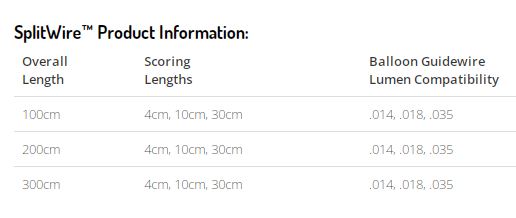 035” Dual Nitinol Wire Scoring Technology (.018” scoring wire /.014” balloon guidewire); Dual wires fused proximal to distal tip; Triangular scoring segment provides focused pressure towards target lesion; Converts any conventional PTA balloon into a scoring balloon; Compatible with maximum rated burst pressure of any PTA balloon; May be used with any PTA balloon diameter and length; 100cm, 200cm and 300cm overall lengths; 4cm, 10cm and 30cm scoring lengths; Single use, disposable.
