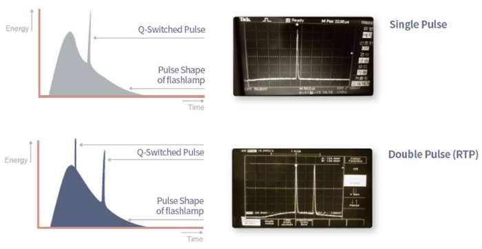 A unique core technology invented and developed in-house, Real Twin Pulse or RTP allows the same energy and interval between the first and second laser pulses emitted by Q-Switched lasers. It is used to produce milder thermal damage in the targeted area and can be used to generate deeper penetration in comparison to a single pulse. HELIOS III’s RTP mode generates a maximum of 2 Joules in output energy.