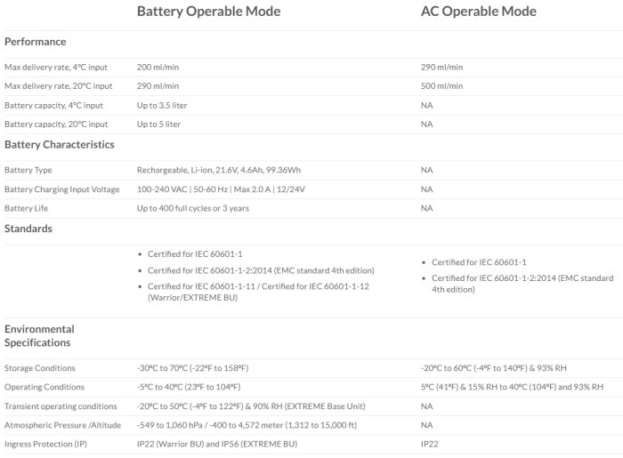 - Unmatched Delivery Rate: From KVO and up to 200/290 ml/min delivery rate at 4 fluid input temperature (battery/AC) and 290/500 ml/min for room temperature fluids (battery/AC)
