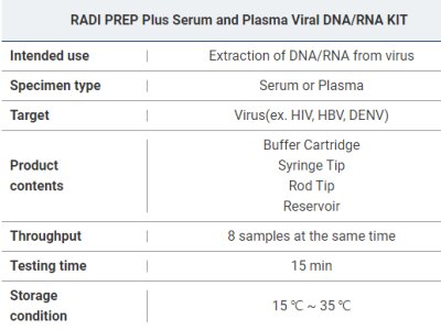 RADI PREP Plus Serum and Plasma Viral DNA/RNA KIT is used to extract virus DNA and RNA from human-originated plasma, serum using RADI PREP Plus Fully Automated Extraction Machine.