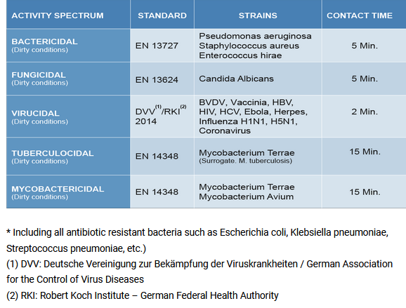 - Virucidal (HBV, HIV, HCV, Herpes, Vaccinia, BVDV, Vaccinia,
