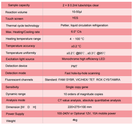 Advantages: Detecting 16 samples at the same time. 4 fluorescence channels. Light & compact, the weight is only 4kg. It can be used with vehicle power supply for immediate onsite detection. Built-in software with large screen panel for ease of use, no need additional computer. 7-inch color touch screen shows all parameters, test results and real time testing curve. Fast temperature control system: unique liquid circulation refrigeration, Variable temperature rate up to 6 /s. Compatible with 0.2ml_ PCR clear tubes or eight strips, can measure 16 samples at the same time. 4GB internal memory. Testing results can be exported with USB or printed. Results can be displayed in 60 minutes.