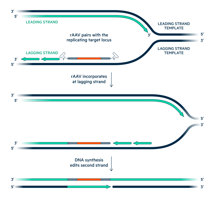 Universal Cells uses recombinant Adeno-Associated Virus (rAAV)-mediated gene editing to engineer chromosomal genes without the use of genotoxic nucleases. Serotype 3B rAAV vectors efficiently infect pluripotent stem cells and their single-stranded DNA genomes pair with homologous chromosomal sequences during replication to precisely alter human genomic sequences.