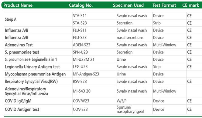 Strep A. Specimen Used: Swab/ nasal wash. Test Format: Device. CE mark: CE.