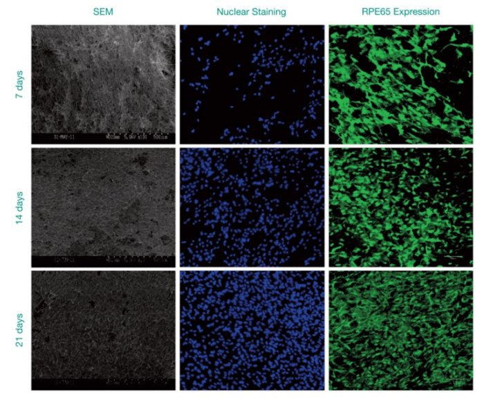 ARPE-19 human retinal pigment epithelial cells attached to the PLLA electrospun scaffolds, formed a monolayer, and continued to proliferate over a time period of 3 weeks. Immunocytochemistry of revealed strong protein expression of RPE65 over the 21 days culture. RPE65 protein is an isomerohydrolase expressed in retinal pigment epithelium which is essential for the regeneration of the visual pigment necessary for both rod and cone-mediated vision and used here as a marker of the differentiation status.