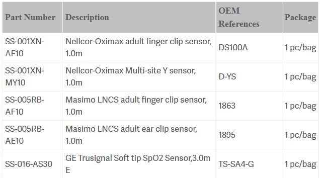 Replacements for OEM, fully compatible; Patient sizes from Neonateto Large Adult; Options: Finger Clip, Soft Tip, Multi-Y Style, Neonate Wrap, Ear Clip and Forhead; Cost savings up to 50%; CE certificate and FDA 510(K) clearance; 12 months warranty.