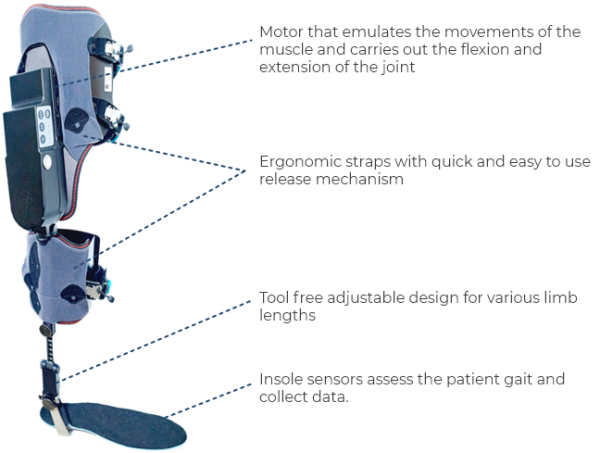 First robotic knee orthosis with adaptable stiffness, which interprets the needs of the patient and provides the strength, mobility and stability necessary to be able to walk. Sensors provides biomechanical analysis of the patient’s gait and works to improve it.