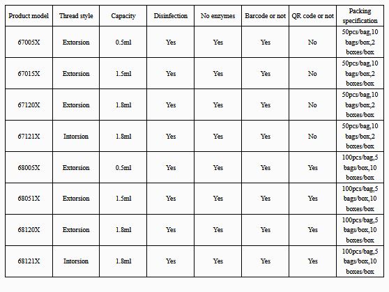 Medical grade polypropylene material, can freeze and thaw repeatedly. 0.5ml, 1.5ml, 1.8ml(outward and inward) a variety of specifications are available. 0.5ml and 1.5ml are suitable for 100 boxes, and 1.8ml are suitable for 81 boxes. The lid of the box can be selected in seven colors: red, yellow, blue, green, white, purple and orange. Electron beam sterilization, no DNase, RNase, no endotoxin, no exogenous DNA tube bar code is unique.