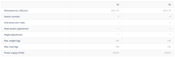 - S4: 4-section with adjustable head section and fold-down arm rests