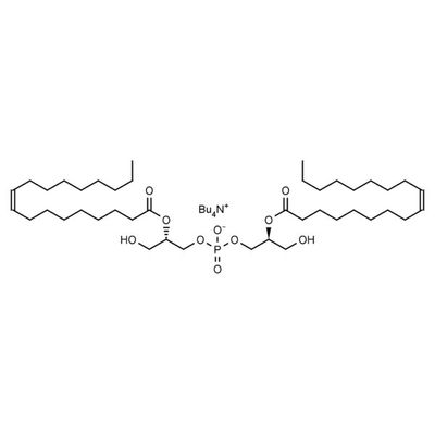 Lysobisphosphatidic acids (LBPAs), known also as bis-(monoacylglycerol)phosphates (BMPs) are specialized lipids reported to play a role in intracellular protein and lipid transport in healthy cells. Their accumulation was observed in pathologic liver tissue, and they also serve as antigens for auto-antibody generation in a human autoimmune condition termed antiphospholipid syndrome. Accumulation of LBPAs in intracellular, often multilamellar membranes is related to biomembrane polymorphism which may impact intracellular cholesterol transport. (S,S) Bisoleoyl-lysobisphosphatidic acid is the naturally occurring, biologically active isomer of LPBA.