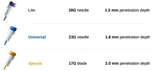 - Various, color-coded product versions to meet specific blood sample applications