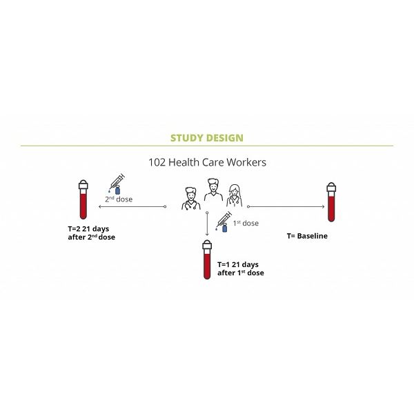- A total of 102 sets of samples were collected from apparently healthy adults that were SARS-CoV-2 IgG negative at the time of vaccine and who received the full course (2 injections) of the Pfizer vaccine, COMIRNATY®