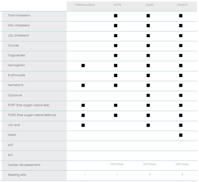 The CR3000 devices provide near patient testing healthcare professionals and lay users a unique panel of assays, including glucose, HBA1c, oxidative stress, lipids, hemoglobin and uric acid. The CR3000 delivers laboratory based technology and accuracy of results via wet chemistry application. The CR3000 analyzers have been devised to help professionals personalise consultancies, improve perceived patient care and reduce lead times for patients to receive the right healthcare advice. Devices are completely stand alone, with an inbuilt printer.