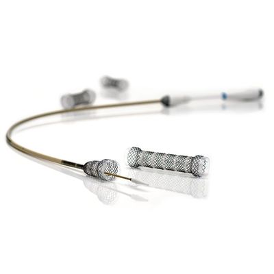 Sutures are located on the distal and proximal ends of the stent to allow repositioning or removal immediately post stent placement.
