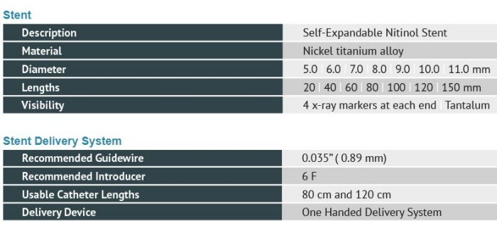 - Nitinol Stent with tantalum markers provides excellent visibility under fluoroscopy