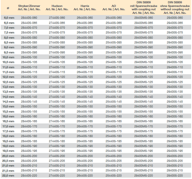 Risa manufactures reamers with stiff and flexible shank as well as reamers with replaceable head systems. In addition to AO and DIN coupling options, we also offer versions with couplings of all renowned manufacturers. The reamers in diameters from 5.5 to 22.0 mm are manufactured in increments of 0.5 mm and lengths of 350, 480 and 700 mm. Please contact us for your personal offer according to your dra wing or sketch.