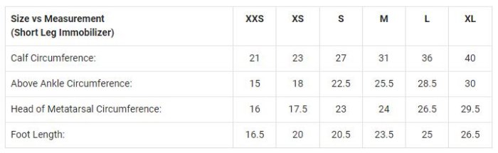 FlexiOH® Short Leg Immobilizer comes in 6 different sizes : XXS, XS, S, M, L and XL. All the casts vary in terms of calf circumference, above ankle circumference, head of meta-tarsal circumference and foot length. For the best fit of FlexiOH® Short leg immobilizer, taking the measurement of the patient’s leg is necessary before application.