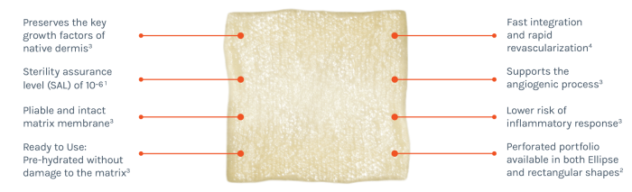 The natural allograft option that is as close to nature as possible. SimpliDerm® is a pre-hydrated human acellular dermal matrix with a sterility assurance level (SAL) of 10-6 and requires a minimal 2-minute sterile rinse for convenient intraoperative use.1 By maintaining a more intact matrix, SimpliDerm enhances and supports the angiogenic process, provides a more pliable matrix, and results in a lower risk of inflammatory response3, fast integration and  rapid revascularization.4 SimpliDerm is available in both Ellipse™ and rectangular sizes designed to meet a range of surgical needs and provide intraoperative ease of use1,2. SimpliDerm with perforations is available to facilitate plane-to-plane fluid transfer upon implantation.2