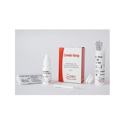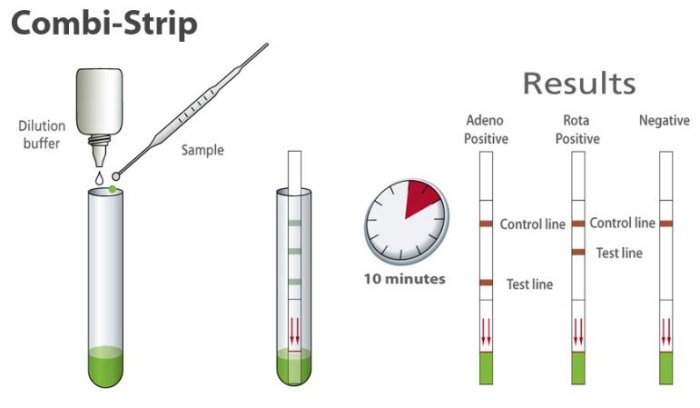 Single immunochromatography test for the dual independent detection of Rotavirus (groupe A) and Adenovirus (subgroups A to F) antigens in human stool samples.