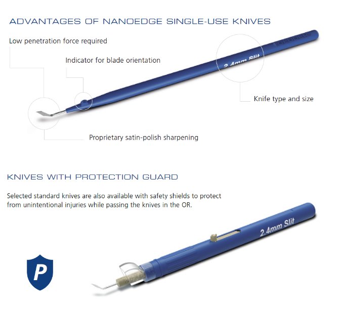 NanoEdge single-use ophthalmic knives stand for high precision and excellent sharpness. They are designed for smooth penetration and accurate incisions. Due to its solid and sharp blades only low penetration force is required to perform effective entries and mostly self-sealing wounds. The outstanding cutting abilities of NanoEdge knives enable better surgical outcomes. Geuder offers an extensive portfolio for most standard and specialty ophthalmic procedures. The wide range of sizes and straight, angled or special shaped blades in double-bevel or bevel-up grinds covers all relevant incision types.
