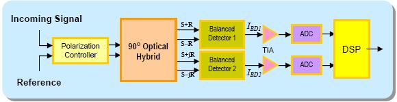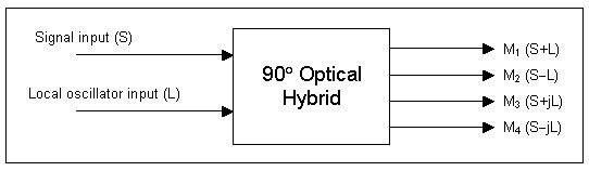 For optical coherent detection, the six-port 90° optical hybrid would mix the incoming signal with the four quadratural states associated with the reference signal in the complex-field space. The optical hybrid would then deliver the four light signals to two pairs of balanced detectors. See below block diagram for 90° optical hybrid and a coherent receiver.