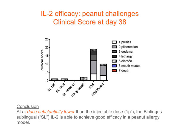 Using low dose SL IL-2 in a peanut allergy model demonstrated that our sublingual therapy is as effective as injected IL-2, but at a dose which is 500 times lower. We believe that the reason for this is that our SLIT technology brings the molecules effectively to the lymphatic system, and thus directly to the immune system itself.