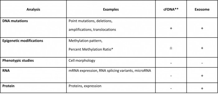 Important cornerstones of cancer treatment, today, are targeted drugs, which are applied once it has been demonstrated that the respective target of the therapeutic is expressed or a specific genetic mutation is present in the cancerous tissue. Tissue is not always available and tissue biopsies are associated with a significant invasive and unpleasant procedure and, therefore, often challenging or impossible to perform, especially in cancer types such as lung or brain tumors and in metastatic disease. Therefore, the blood-based diagnostic approach, the so-called „liquid biopsy“, could solve these issues. Today, the purification of circulating free DNA (cfDNA) and subsequent mutation analysis is used by various in vitro diagnostics such as PIK3CA mutation analysis. cfDNA is able only to address the determination of point mutations, DNA deletions, amplifications and translocations. RNA- and protein analysis cannot be addressed through cfDNA. Exosomes, which supposingly represent the phenotype of the cell of origin, can offer these analyses. The following table highlights the differences in applications of cfDNA vs. exosome analysis.