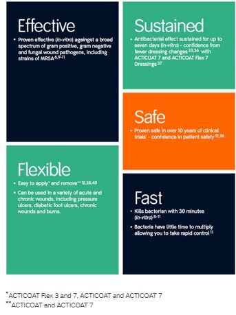 ACTICOAT is a range of dressings that utilize the antimicrobial properties of silver to provide an efficient and effective barrier to bacterial penetration.3 Flexible, absorbent and conformable, each ACTICOAT variant is developed with properties specific to its required use.1,2