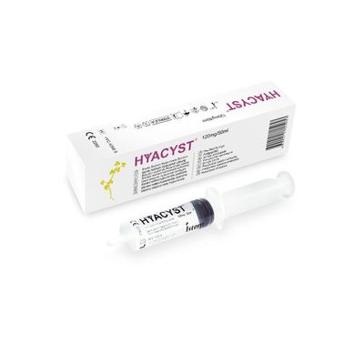 HYACYST is classified as a medical product that consists of highly purified natural hyaluronic Acid of non-animal origin in buffered physiological sodium chloride, having a pH of 7.1-7.3. Hyacyst® is a viscous solution consisting of a low molecular weight fraction and it is utilised as a sterile rinsing fluid with urothelial changes in the ureter, urinary bladder and the initial portion of the urethra.