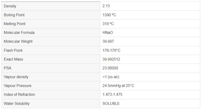 Product Name: Caustic soda. CAS Number: 1310-73-2. Molecular Weight: 39.997. Density: 1.515 g/mL at 20 °C Boiling Point: 145 °C. Molecular Formula: HNaO Melting Point: 681 °C(lit.). Flash Point: 176-178°C.