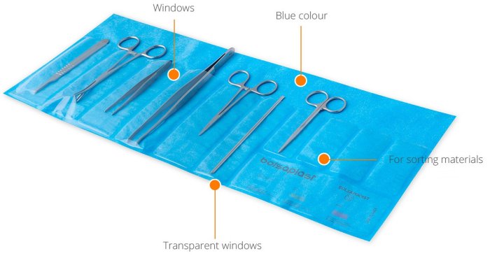 Blue sorting pouches with transparent pockets, especially designed for sorting products in metal containers, in flexible packaging (pouches/rolls), or in sterilisation areas. They can also be used as extra protection during the transport of instruments to prevent breakage and damage. Thanks to its different pockets, materials can be classified and their storage and distribution is optimised. This is considered a single-use product and it is important to note that it is not a sterile barrier system.