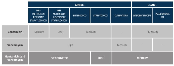 When combined, Gentamicin and Vancomycin have a synergistic action against bacteria. Their range of action covers approximately 90% of the pathogenic agents generally isolated in surgical infections. The Gentamicin and Vancomycin combination is the most commonly used and published combination in cases of concomitant treatment of orthopaedic infections.