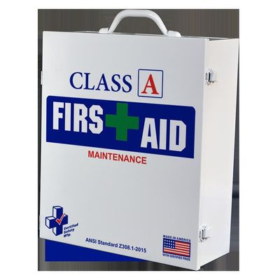 Heavy duty metal cabinet, Filled with a large variety of high-quality first aid products, Back plates are color coded which makes it simple to see what product is missing, making the inventory and reordering process much quicker, Pre-drilled holes allow fast and easy removal of wall mounted kits in an emergency, Strong latches keep the first aid kit closed and secure, Read below for product SDS sheets.