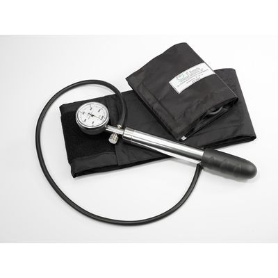 Metal pump with accuracy manometer; alternatively available with pressure 0-300mmHG or 0-600mmHG; shipped with adult and thigh cuff 1 tube.