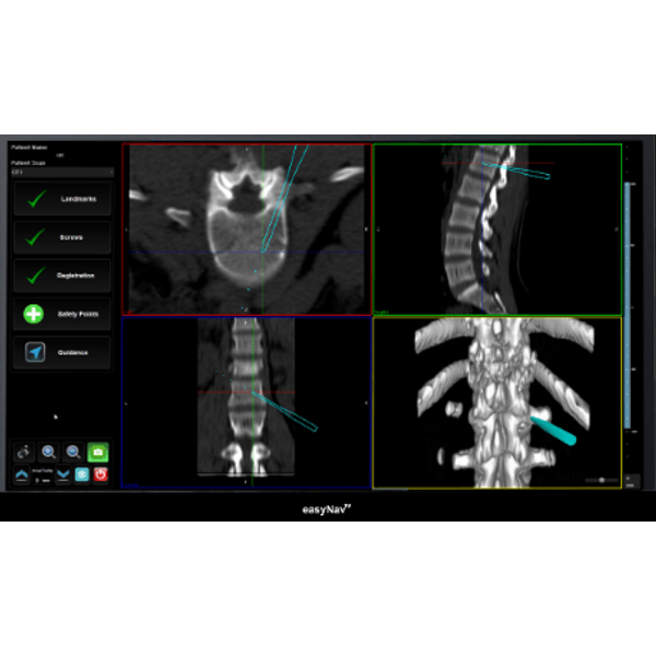 The easyNav™ CT based navigation is based on manual point registration and axial view makes it well suited for complex open procedures such as scoliosis. We use enhanced surface matching algorithms which eliminate the tedious registration process by keeping it simple and intuitive and ensures the highest degree of accuracy. Wireless control with smart remote eliminates the need of any additional personnel or touch-screens to run the system. easyNav™ navigation software also allows you to plan the pedicle screws for precise and safe placement of screws.